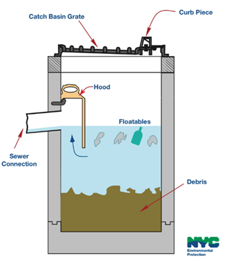 New York City has more than 150,000 catch basins, also known as storm drains, that are an important part of the City’s 7,500‑mile sewer network. These curbside grates channel stormwater into underground pipes that carry it to one of DEP’s 14 wastewater resource recovery facilities or directly into local waterways.