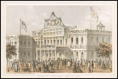The publication of her Majesty's message to the President of the United States on the morning of August 17, [1858] carrying with it, as it did, the assurance that the telegraphic wires were really capable of transmitting dispatches, caused an outburst of enthusiasm in the Atlantic States….Wherever the news penetrated there was a public jubilee….but in New York the most thorough and systematic display of popular joy took place….[T]he principal feature of the celebration was the illumination of the city at night, together with the display of fireworks provided by the municipality… . It unfortunately happened that some sparks fell upon the woodwork of the clock tower of the City Hall, and flames burst out there about midnight, which finally consumed the tower, and largely damaged the building itself. As the central fire-alarm was located on this spot, the intelligence could not be communicated instantly, as usual, to the engine-houses, and the delay which ensued proved fatal to the structure. The scene, however, was magnificent. The statue of Justice, a familiar sight to all New Yorkers, stood wrapt for a length of time in the flames of the grand illumination, and serenely endured the fiery glow for more than an hour, until at length she was observed to totter and fall into the flames. Many valuable paintings, and some relics of General Washington, were injured by the water; but the city and judicial records were, fortunately, not endangered. Fifty thousand dollars are required to repair the injury caused by this disaster. (Illustrated London News. September, 1858)