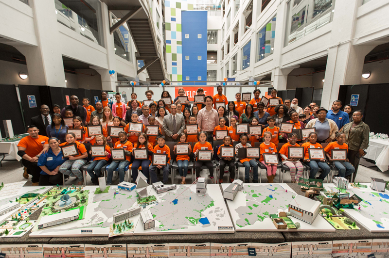 Long Island City, NY—In observance of national Take Your Child to Work Day, 50 kids filled the DDC’s office atrium on Thursday, April 28, to spend the day making large scale three-dimensional study models of DDC projects from across the five boroughs, including the Bronx Museum of Art, Central Park Precinct in Manhattan, Weeksville Heritage Center in Brooklyn, Ocean Breeze Athletic Complex in Staten Island and the Queens Botanical Garden.