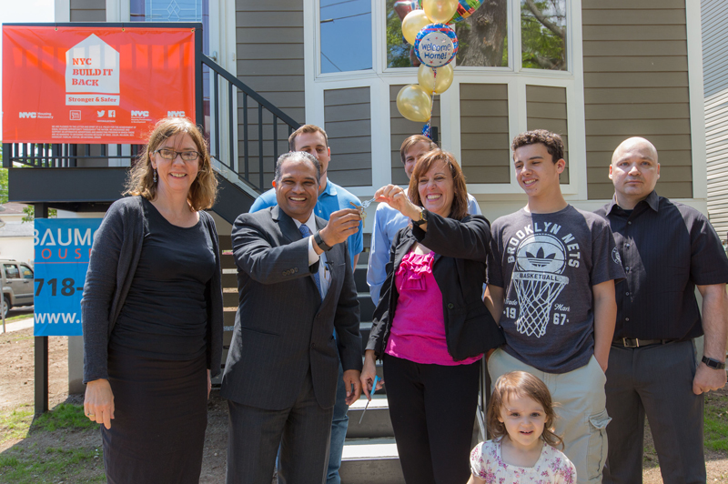 Staten Island, NY—On Thursday, May 19, the New York City Department of Design and Construction (DDC) completed its first home elevation project in Staten Island as part of its work with the City’s Build it Back program, the federally funded program which rebuilds, repairs, and elevates homes affected by Hurricane Sandy. The project completion was marked by a ceremony at the home at 528 Greeley Avenue, where DDC Commissioner Feniosky Pena-Mora and Amy Peterson, Director of the Mayor’s Office of Housing Recovery, presented the keys to homeowner Michele Thornton-Mannix and her family.