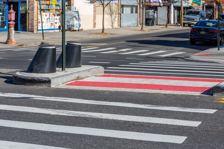 New traffic islands on Utica Avenue calm traffic and make it safer for pedestrians to cross the street.