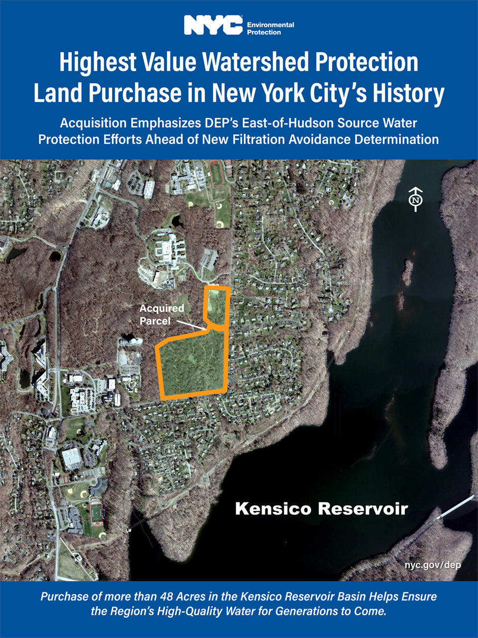 Mount Pleasant, NY—The New York City Department of Environmental Protection (DEP) today announced the highest value watershed land purchase ever made to protect the City’s drinking water supply. The $12.56 million acquisition of more than 48 acres near the Kensico Reservoir in Westchester County is consistent with the agency’s evolving science-based priorities in water quality protection efforts and a major investment in safeguarding clean, high-quality water for generations to come.