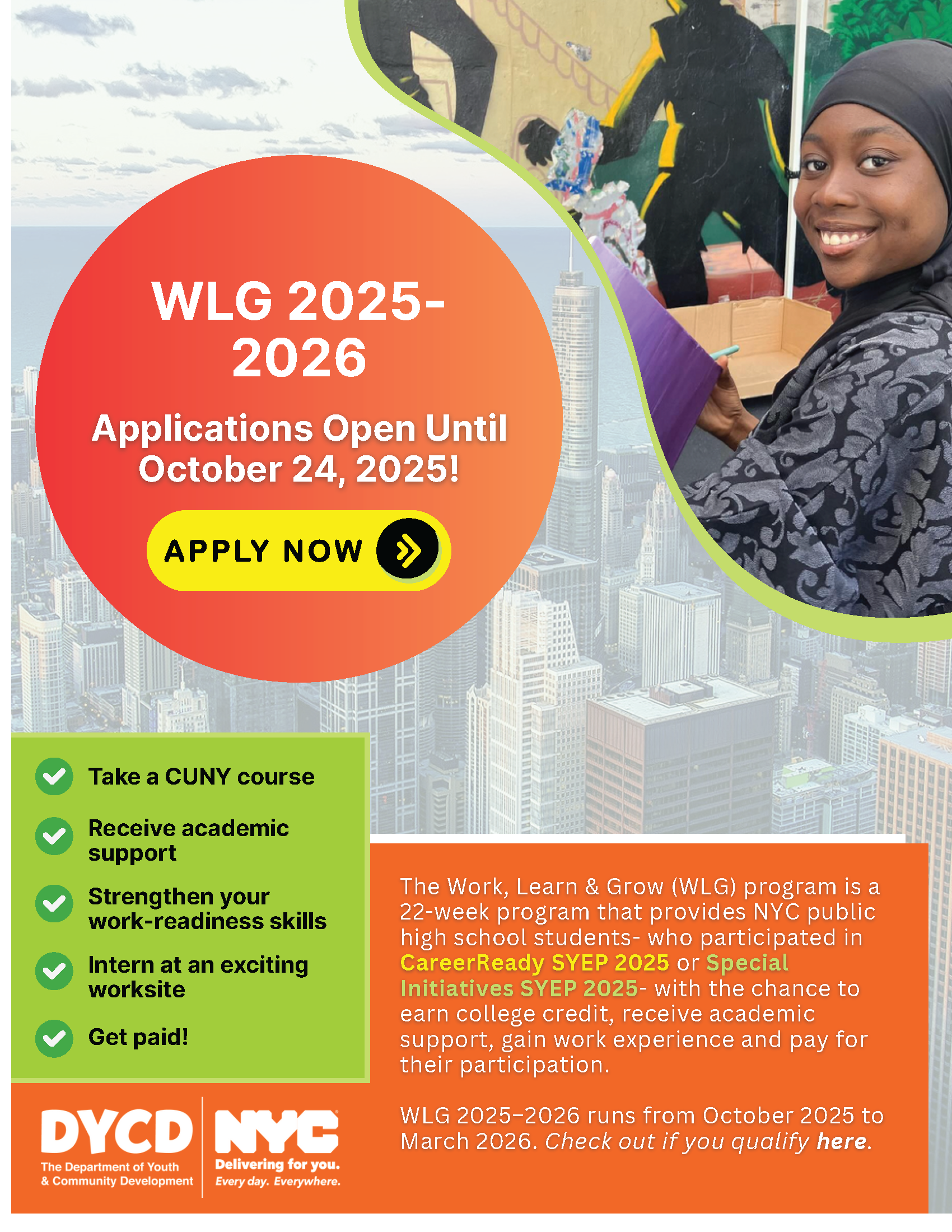 Attend a CUNY Course & Gain Work Experience with our Work, Learn & Grow Program! Work, Learn & Grow offers NYC youth between the ages of 16 and 20 a paid 22-week-long opportunity to strengthen their work-readiness skills, explore postsecondary education and careers, and potentially earn college credit. See if you qualify for Special Initiatives or CareerReady WLG Programming here. Program Offerings