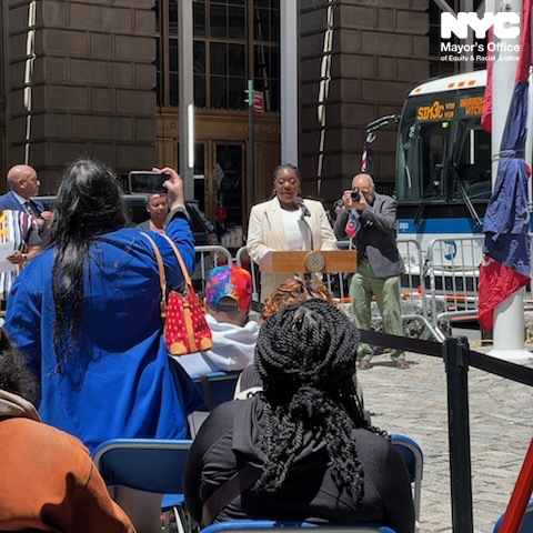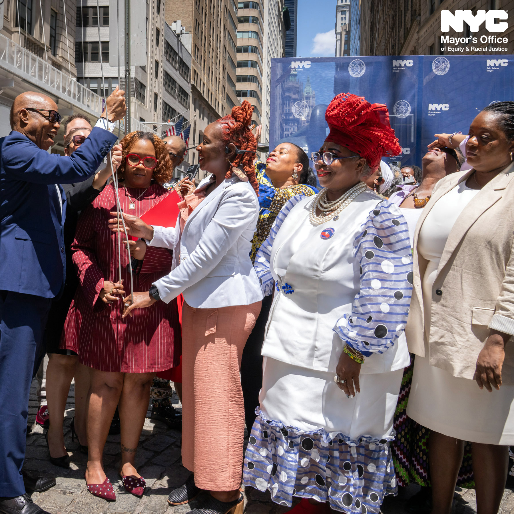 June 2, 2025, NYC Mayor’s Office of Equity & Racial Justice (MOERJ) Commissioner Sideya Sherman joined Mayor Eric Adams and city leaders at Bowling Green for the Juneteenth flag raising ceremony. As the flag rose over New York City, we honored the legacy of those who fought for freedom and reaffirmed our commitment to equity, liberation, and unity for all New Yorkers.