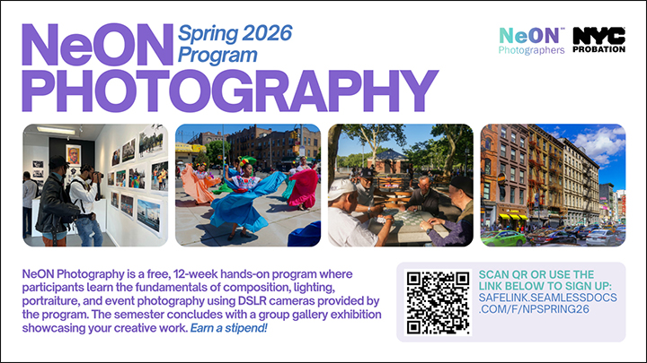 NeON Photography is a dynamic creative arts initiative launched by the New York City Department of Probation’s Neighborhood Opportunity Network (NeON). We empower individuals on probation and from underserved communities across seven NYC neighborhoods by providing hands-on, professional photography training.