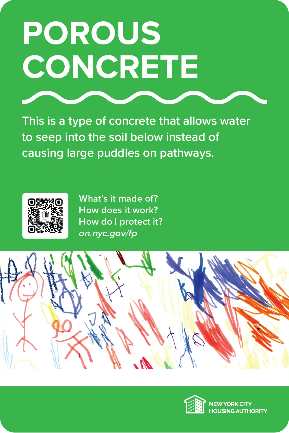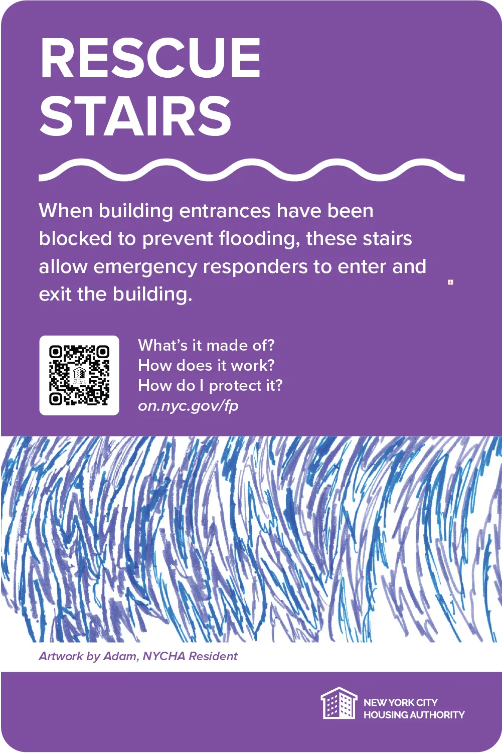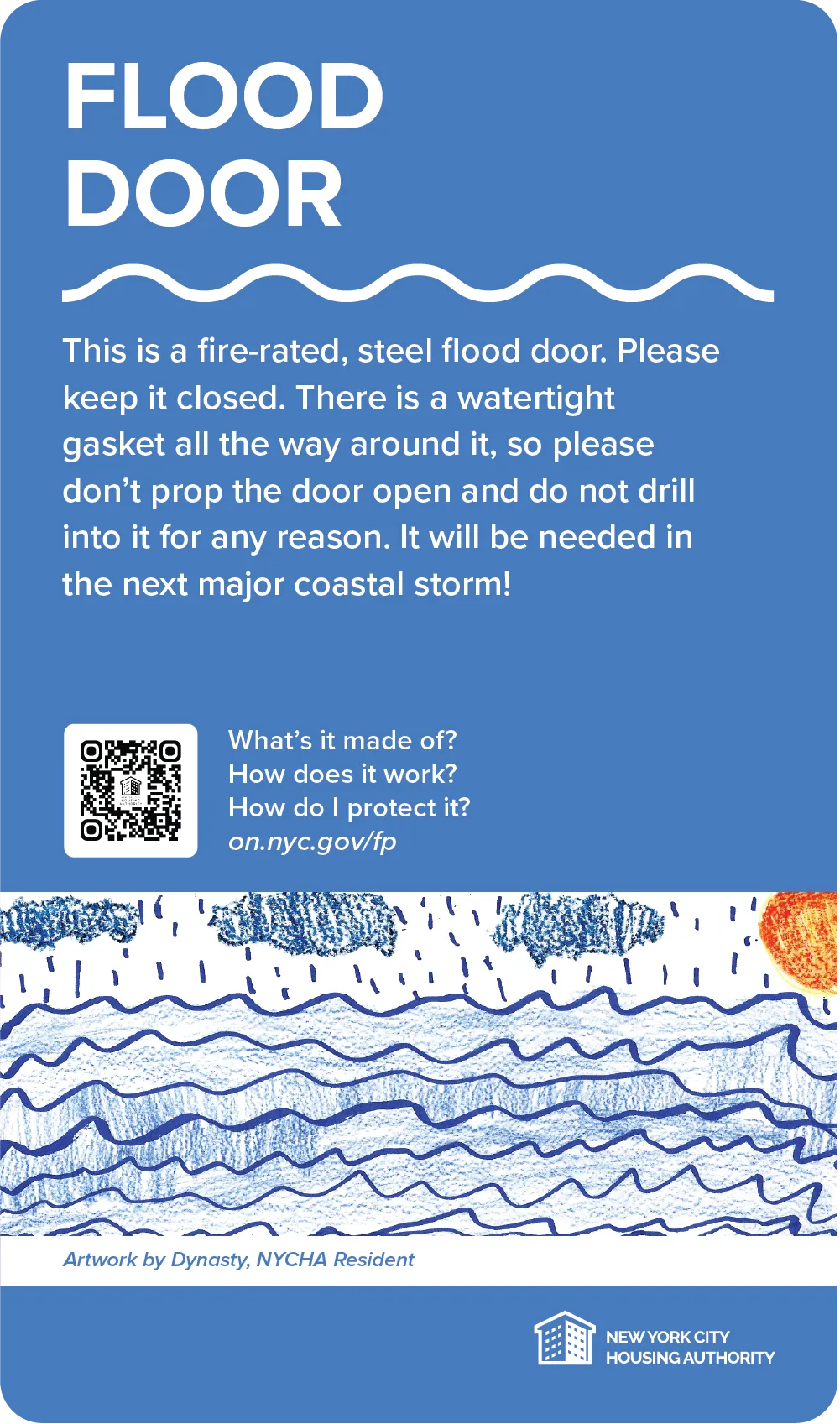 NYCHA created signs to highlight flood protection improvements in response to Hurricane Sandy at Beach 41st Street Houses in Queens, Coney Island Houses in Brooklyn, and Riis II Houses in Manhattan. Located very close to Jamaica Bay, the Atlantic Ocean and the East River, respectively, these developments were hit hard by Hurricane Sandy.