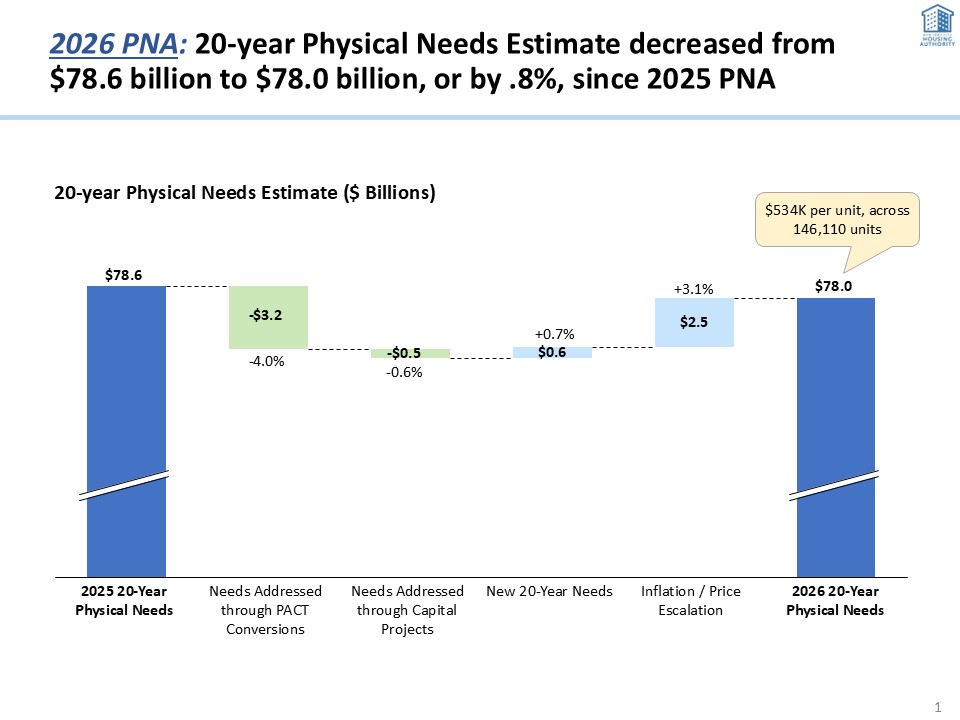 An update to the PNA estimates was undertaken based on January 2026 data to reflect capital needs that have been addressed as well as new needs and inflation. The total 20-year physical needs decreased from $78.6 billion in 2025 by $0.6 billion or 0.8% to $78.0 billion, as shown in the chart below. Reductions in the physical needs came from PACT conversions ($3.2 billion) and completed capital projects ($0.5 billion). Offsetting those reductions was the addition of new 20-year physical needs ($0.6 billion) that were previously beyond the 20-year time horizon, and inflation and price escalation ($2.5 billion).