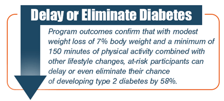 of 150 minutes of physical activity combined with other lifestyle changes, at-risk participants can delay or even eliminate their chance of developing type 2 diabetes by 58%.